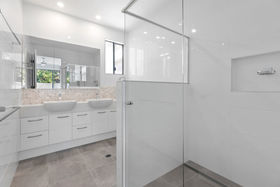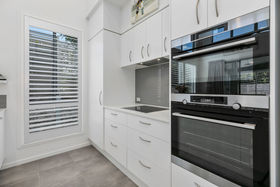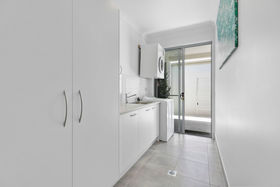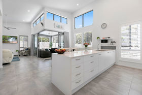 This lovely open plan design boasts a superb chef's kitchen in pristine winter white with crisp white stone tops and comes complete with state of the art AEG appliances. The addition of a practical and serviceable butlers pantry adds further storage and a definite touch of luxury.