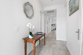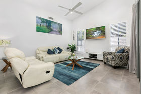 Nestled amongst lush greenery and attractive retained gardens this practical design offers luxury living in a cleverly mastered home without compromising space or creature comforts. Double height ceilings with clerestory windows promotes passive cooling and is complemented by ducted air conditioning and fans throughout.