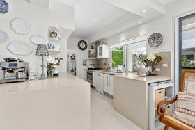 The kitchen boasts latte coloured Caesar stone solid bench tops with waterfall ends & pull-out pantry and a large Ilve 6 burner stainless steel gas cooker and electric oven.